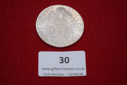 Maria Theresa silver thaler, 1780 restrike. Draped bust right; rev. crowned double-headed imperial eagle with shield.