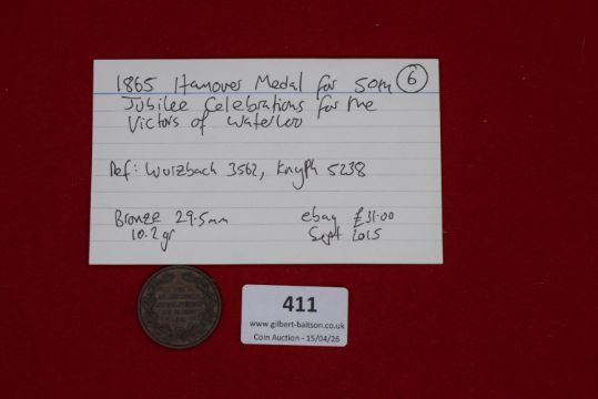 1865 Hanover medal for Waterloo jubilee celebrations, bronze, 29.5mm (ref. Wurzbach 3562; Knypf 5238).