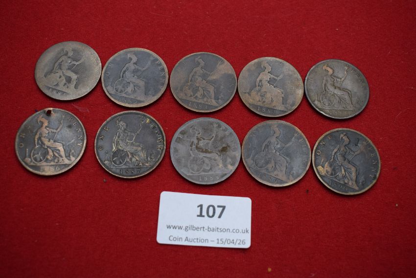 Ten Victorian bronze pennies dated between 1881 and 1890 (various), mostly well worn, one holed.