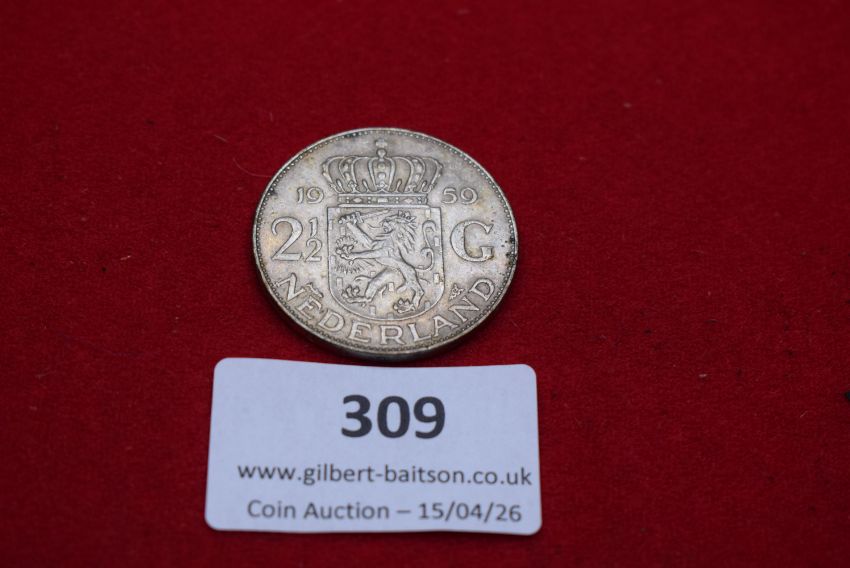 Netherlands 2½ Gulden, 1959, Queen Juliana issue. Silver. Very fine.