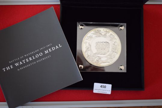 “Battle of Waterloo 1815–2015” commemorative medal by Benedetto Pistrucci, silvered bronze proof-like issue (approx. 400g), cased with booklet.