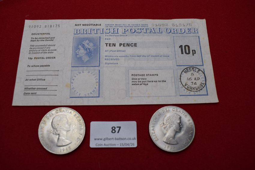 Commemorative crowns (4) and postal order. Comprising two Elizabeth II Churchill crowns, two 1965 Churchill crowns, and a British Postal Order for ten pence dated 1974.