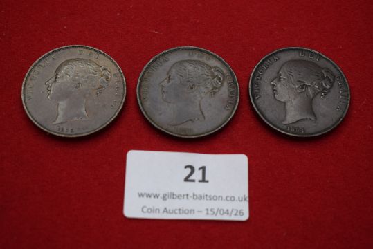 Victoria copper pennies (3), 1862–1864. Young head left; rev. Britannia seated with trident and shield.