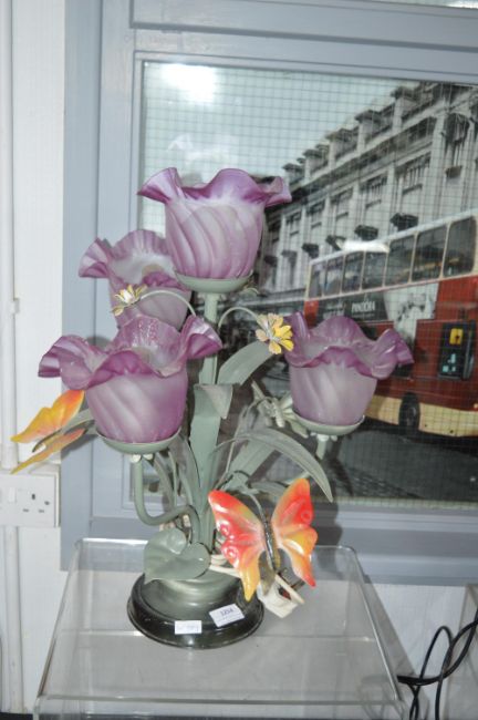 Metal Table Lamp with Flowers & Butterfly Decoration and Purple Frosted Glass Shades