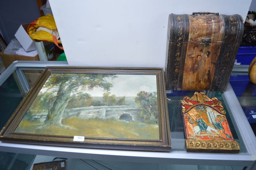 Russian Icon Painted Wine Case, and an Oil on Canvas