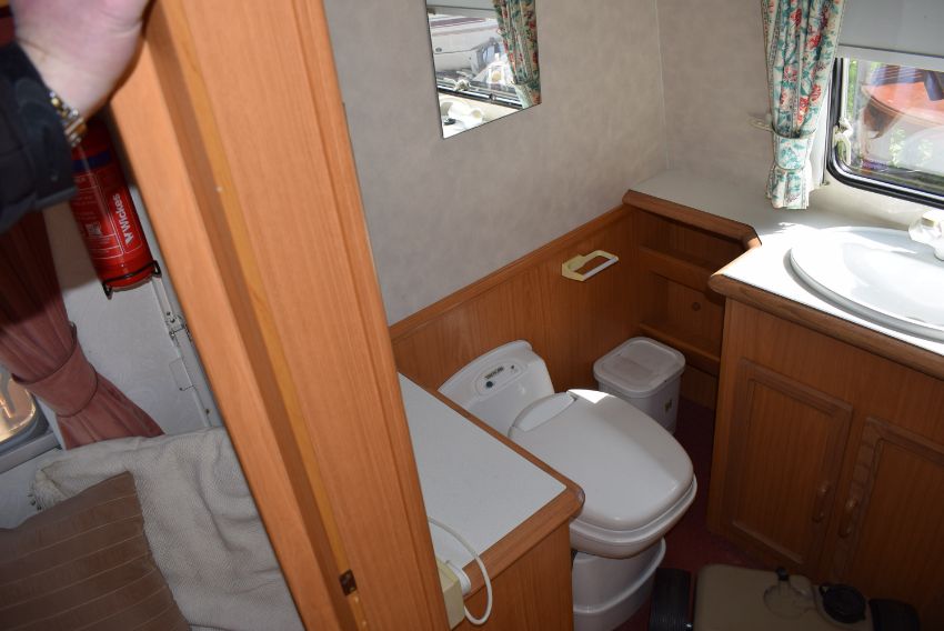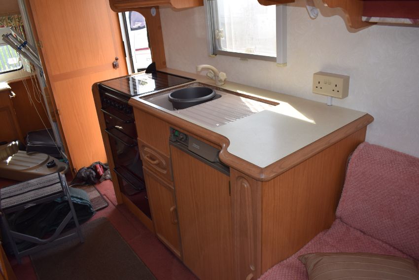 Rialto by Avendale 550-4 Four Berth Single Axle Touring Caravan with Rear Bathroom, with Accessories Including Kampa Pro Rally Air 260 Inflatable Awning, Waste Water and Fresh Water Tanks, Clothes Airer, Caravan Steps, Al-Ko Towbar Hitch, Crockery, Plates, etc.